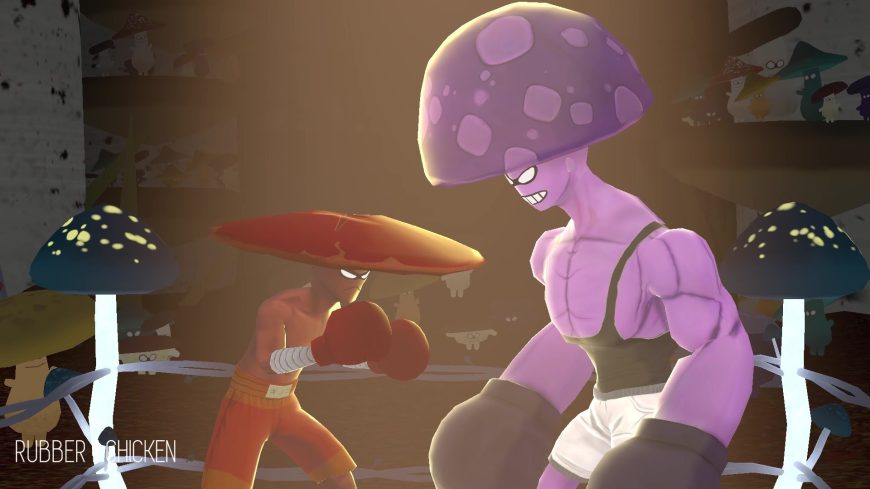 Pois, o jogo ainda chegou a ter bastantes iterações em termos de design antes de começar a trabalhar nele, no inicio eu sabia que queria fazer alguma coisa rítmica, a ideia do boxe veio um pouco naturalmente dado que o boxe é um desporto aonde o ritmo é essencial (não tanto o ritmo musical mas era perto o suficiente) nos primeiros designs as personagens eram humanas, mas isso era um pouco limitado em termos de cores e também era um pouco genérico, dai fui explorando outras coisas, animais, robots, etc… honestamente não sei muito bem dizer como é que eu calhei em cogumelos, suponho que sempre gostei deles, mas as formas e cores dos diferentes cogumelos acabaram por ser uma fonte enorme de inspiração para as personagens do jogo.