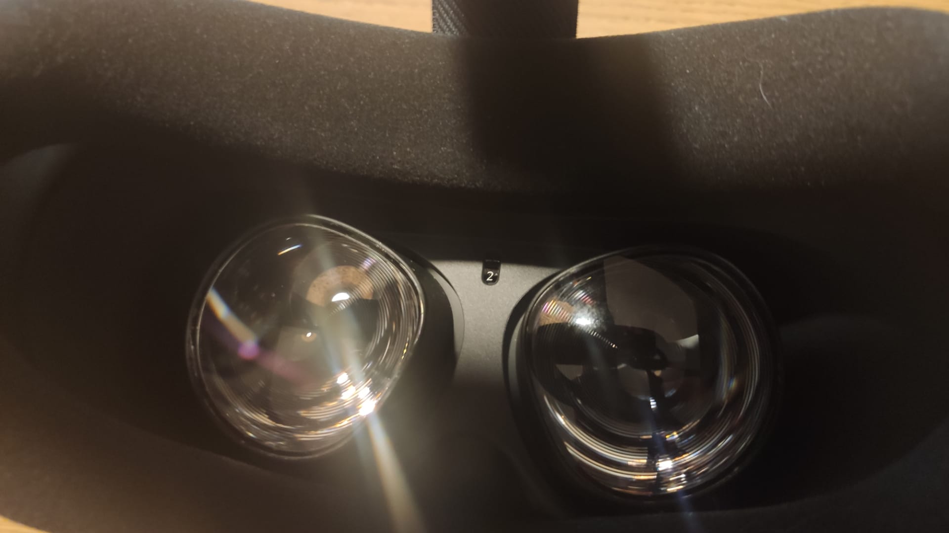 Antes de colocar o headset devemos ter atenção a um pormenor: os dispositivos de VR mais avançados, como é o caso do Quest 2, têm ajuste de IPD (interpupillary distance – distância entre as pupilas), este ajuste permite mover as lentes de VR até encontrar a posição mais confortável para os nossos olhos, permitindo uma imagem mais detalhada, clara e bem focada. O Quest 2 tem 3 opções de IPD, que se podem ajustar mexendo diretamente nas laterais das lentes para a esquerda e para a direita. A posição 1 corresponde a 58mm, sendo indicada para quem tem um IPD inferior a 61mm, a posição 2 a 63mm, indicada para quem tem entre 61 e 66mm, por fim, a 3, é de 68mm, destinada a quem tem um IPD maior do que de 66mm. Para medir facilmente o nosso IPD aconselho a aplicação GlassesOn na Play Store, é gratuita, extremamente eficaz e mediu o meu IPD com uma precisão fantástica (62.5mm). Assim, ajustei para a posição 2 e prossegui para a configuração.