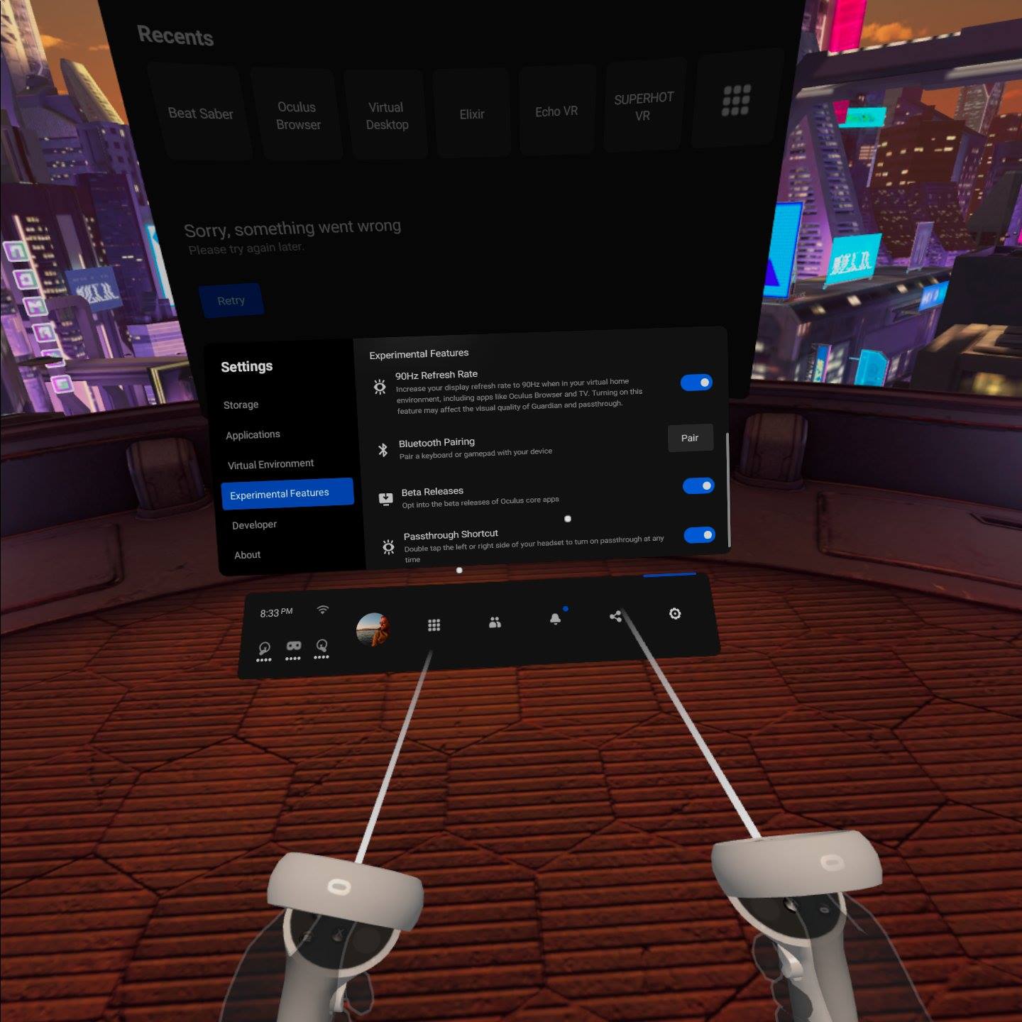 De volta ao menu podemos escolher os temas da nossa home, desde uma casa solarenga até um apartamento retirado “diretamente” do Cyberpunk 2077. A navegação nos menus é simples, desde o acesso à store, definições, entre outros. E nas definições há que realçar um pormenor, existem uma série de experimental features que podem ser ativadas, ou não. Uma delas é das coisas mais úteis que o Oculus Quest 2 tem: fazendo um double tap na lateral do HDM a aplicação é pausada e ligam-se as câmaras exteriores, uma função ideal para nos reorientarmos. Outra é a de ativar os 90hz, tendo em consideração que ainda estamos em período de transição e a grande maioria dos jogos e aplicações ainda correm a 72hz.