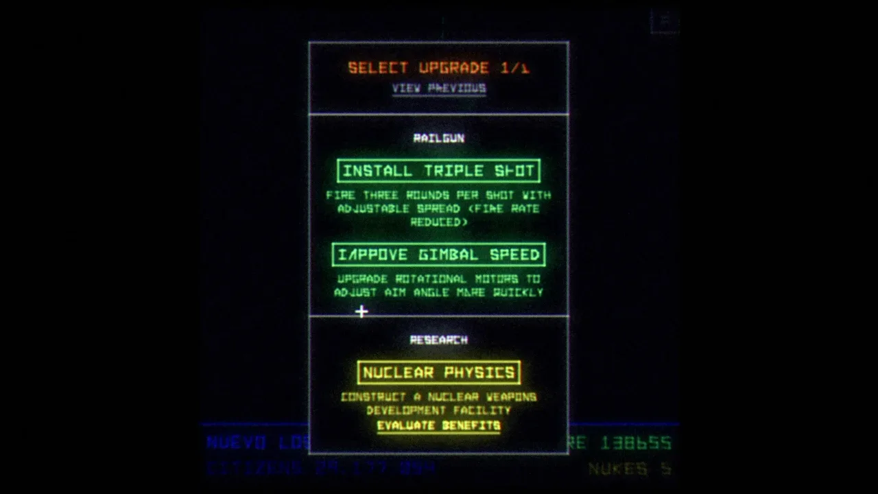 No final de cada dia podemos escolher um upgrade por entre algumas opções, mas de forma geral podemos melhorar a nossa torreta, investir na pesquisa de novas melhorias ou melhorar o nosso escudo. Se surgir a opção também podemos ir pedindo novas opções sem qualquer custo. Consoante vamos investigando vamos tendo mais opções para ajudar na nossa defesa, todas elas muito úteis.