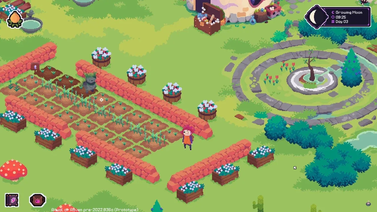 No meio de algumas mecânicas muito mais habituais, a pièce de résistance de Ritual of Raven é que não somos nós que faz a lide da terra. A agricultura é feita por constructs, caldeirões autómatos que programamos para executarem todas as acções necessárias às culturas, através do emprego de cartas com movimentos ou acções. Uma combinação bem esgalhada de progamas que podem ser salvos, e da brilhante ideia de ter a carta de crescimento “instantâneo” et voilá, crescimento praticamente infinito apenas com um clique. Rápido, prático, eficaz.